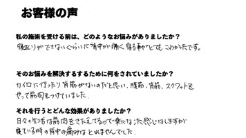 最初は腰を曲げるのも、ベッドに横たわるもの辛く、どんな動きをするのもとても辛かったです。寝起きも数十分掛けて起き上がっていたのに、今はとても楽に動けます。すっと動作ができる状態になりました。